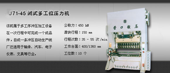 JA71系列壓力機屬于多工序沖壓加工設備,在一次行程中可完成一個成品件,自成一條沖壓自動生產線。本機廣泛適用于軸承、汽車、電子、儀表、文具等行業。